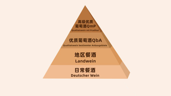 德國作為歐盟成員國之一,出產的葡萄酒也遵循這一法規。德國的葡萄酒從低至高主要分為四個等級:日常餐酒(Deutscher Wein)、地區餐酒(Landwein)、優質葡萄酒(Qualitatswein bestimmter Anbaugebiete,簡稱QbA)和高級優質葡萄酒(Qualitatswein mit Pradikat,簡稱QmP)。