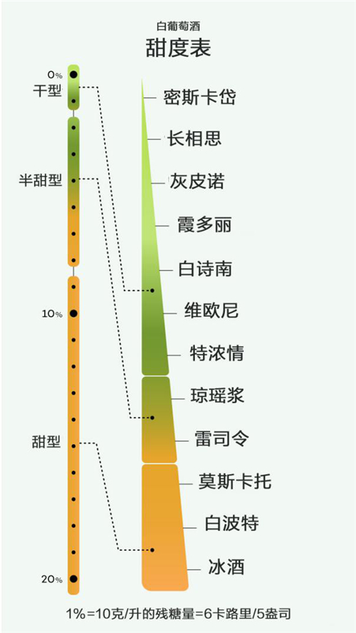 通常,殘糖量低于 1%的 葡萄酒被認為是干型;高于 3% 的葡萄酒被認為是“近乎干”或半甜型;高于 5% 以上是明顯的甜型!而甜葡萄酒殘糖量的范圍在 7-9% 之間。