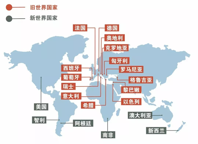 在逛展會的時候我們經常會聽到說,這個是來自新世界國家的葡萄酒,那個是來自舊世界國家的葡萄酒,有的可能會問新世界的葡萄酒怎樣怎樣,舊世界的葡萄酒怎樣怎樣。那么,新舊世界的葡萄酒到底有什么不一樣的呢?