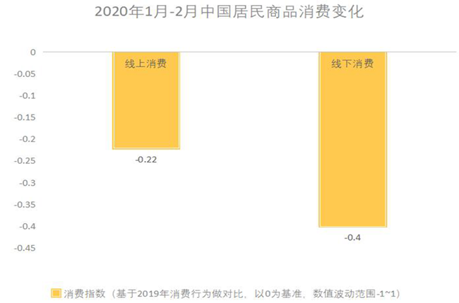 疫情期間,實際消費指數均呈下滑態勢,但線上消費依舊可觀。對比2019年,2020年我國消費者整體線上消費指數為-0.22,線下消費指數為-0.40(數據來源:艾瑞咨詢)。