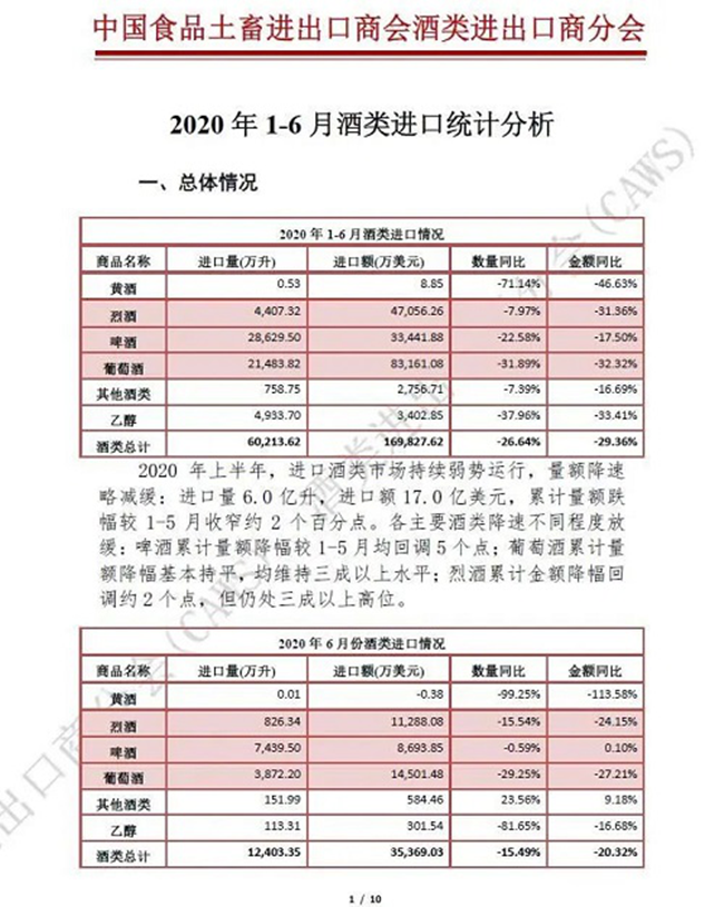 2020年上半年,進口酒類市場持續弱勢運行,量額降幅略減緩:進口量6.0億升,進口額17.0億美元,累計量額跌幅較1-5月收窄約2個百分點。其中,上半年葡萄酒進口量2.1億升,進口額8.3億美元,累計量額降幅維持三成以上水平,在酒類進口總額中占比下滑至49.9%。