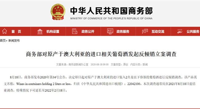 8月18日,商務(wù)部發(fā)布公告稱,決定即日起對(duì)原產(chǎn)于澳大利亞的進(jìn)口裝入2升及以下容器的葡萄酒進(jìn)行反傾銷(xiāo)調(diào)查。
