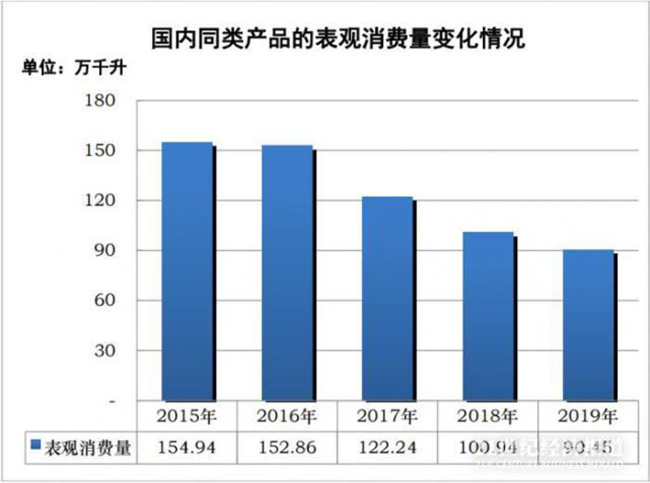 一方面,國(guó)內(nèi)產(chǎn)業(yè)同類(lèi)產(chǎn)品的產(chǎn)量由2015年的116.11萬(wàn)千升下降至2019年的45.15萬(wàn)千升,大幅減少61.11%。