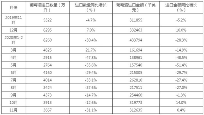 2015-2020年11月中國葡萄酒進口金額及增速