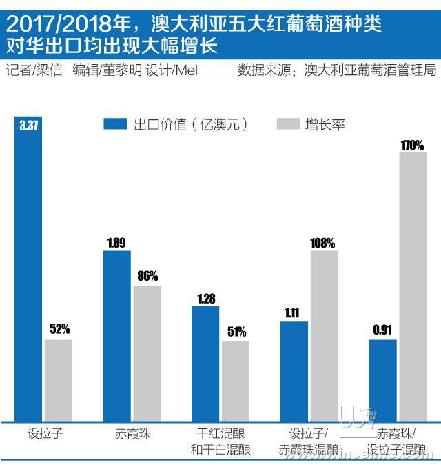 2017/2018年,澳大利亞五大紅葡萄酒種類對(duì)華出口均出現(xiàn)大幅增長(zhǎng)。設(shè)拉子增長(zhǎng)52%至3.37億澳元,赤霞珠增長(zhǎng)86%至1.89億澳元,干紅混釀和干白混釀增長(zhǎng)51%至1.28億澳元,設(shè)拉子/赤霞珠混釀增長(zhǎng)108%至1.11億澳元,赤霞珠/設(shè)拉子混釀增長(zhǎng)170%至9100萬澳元。