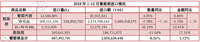 2018 年,葡萄酒進(jìn)口量雖出現(xiàn)了自 2014 年來(lái)的首次下行數(shù)據(jù),但跌幅較小,且進(jìn)口額依然實(shí)現(xiàn)了微幅增長(zhǎng),達(dá)到 28.6 億美元,約占酒類(lèi)進(jìn)口總額的 49.5%,位列進(jìn)口酒類(lèi)第一位。其中:
