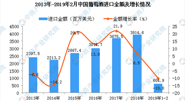 從金額方面來看,2013年-2014年中國葡萄酒進(jìn)口金額有小幅度下降,2015年-2018年中國葡萄酒進(jìn)口金額增長;2019年1-2月中國葡萄酒進(jìn)口金額為604.9百萬美元,同比下降10%。