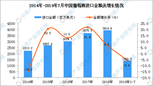 從金額方面來看,2019年1-7月中國葡萄酒進口金額為1401.6百萬美元,同比下降5.6%。