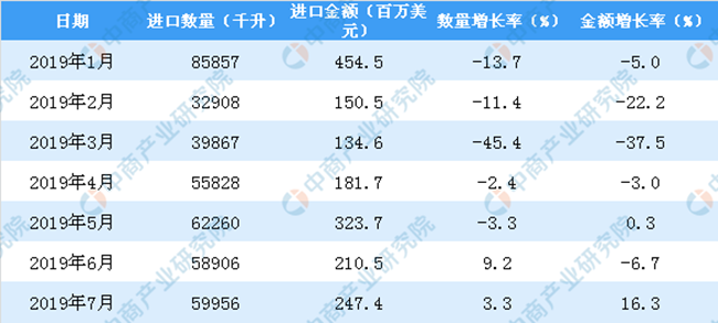 2019年1-7月中國葡萄酒進口數量及金額增長率情況