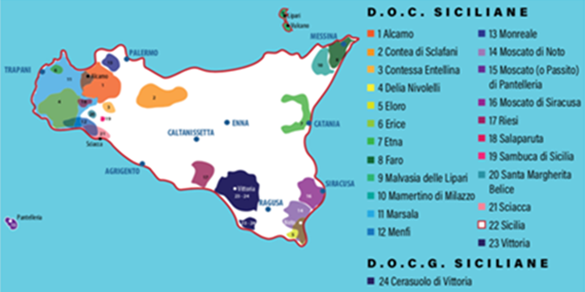 西西里地處歐亞中東的十字路口,是地中海最大的島嶼。大自然的恩賜使這里十分適宜葡萄生長。島嶼整體呈典型的地中海氣候,但又因島內(nèi)多樣性的地形,造就了各具特色的區(qū)域風格:內(nèi)陸干燥而熾熱,海岸暖風習習,埃特納火山以及山丘地區(qū)濕潤而涼爽。因此,西西里成為了意大利最大的葡萄種植區(qū),出產(chǎn)各式性格鮮明的葡萄酒。西西里因其戰(zhàn)略性的地理位置,在歷史上曾是兵家必爭之地。也成就了其悠久的釀酒歷史,最早可追溯至公元前8世紀。如今的西西里是意大利第一個追求有機種植的地區(qū),尊重自然和可持續(xù)性發(fā)展。越來越多的釀酒師致力于打造新鮮而直接的美酒,選擇更為現(xiàn)代的風格,適應(yīng)國際菜肴的搭配。近年來,西西里葡萄酒生產(chǎn)取得了突飛猛進的進步:2018年瓶裝產(chǎn)量約為8000萬瓶,較之2017年的3000萬瓶增長了167%。而2019全年的瓶裝產(chǎn)量預(yù)計會達到1億瓶。