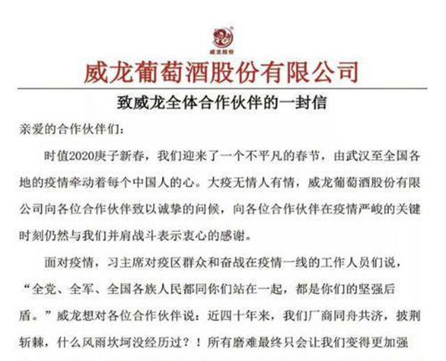 在威龍葡萄酒發(fā)布的公開信中能看到,企業(yè)正試圖通過“攜手并肩,共渡時艱”這樣的積極話語來增強與合作伙伴之間的聯(lián)系。記者從威龍葡萄酒方面進一步了解到,除了在公開信中表達的正面語言,企業(yè)還提出了具體的“渡過時艱”舉措,例如陸續(xù)恢復物流配送以保障合作伙伴的訂單發(fā)貨需求、強化疫情管控等。