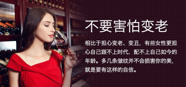 七、不要害怕變老:時間會改變?nèi)蓊仯咸丫埔矔S著時間的流逝而改變其本身瑰麗的色澤。每一位女性就像一瓶瓶具有陳年價值的紅酒,在最初釀制的酸澀,如女性青春年少的清新自然;而后陳年到最佳適飲年份,這時候的紅酒就像到了最具女性魅力的黃金年華,端莊優(yōu)雅;再隨后這瓶葡萄酒陳年變成了老酒,這時候的葡萄酒雖然過了最佳適飲年份,風味卻更加的復(fù)雜,不少紅酒愛好者都不遺余力的追逐這些陳年老酒。而這時候的女性因為時間、閱歷的沉淀,沒有了青澀,卻更加大氣,貴氣自生。